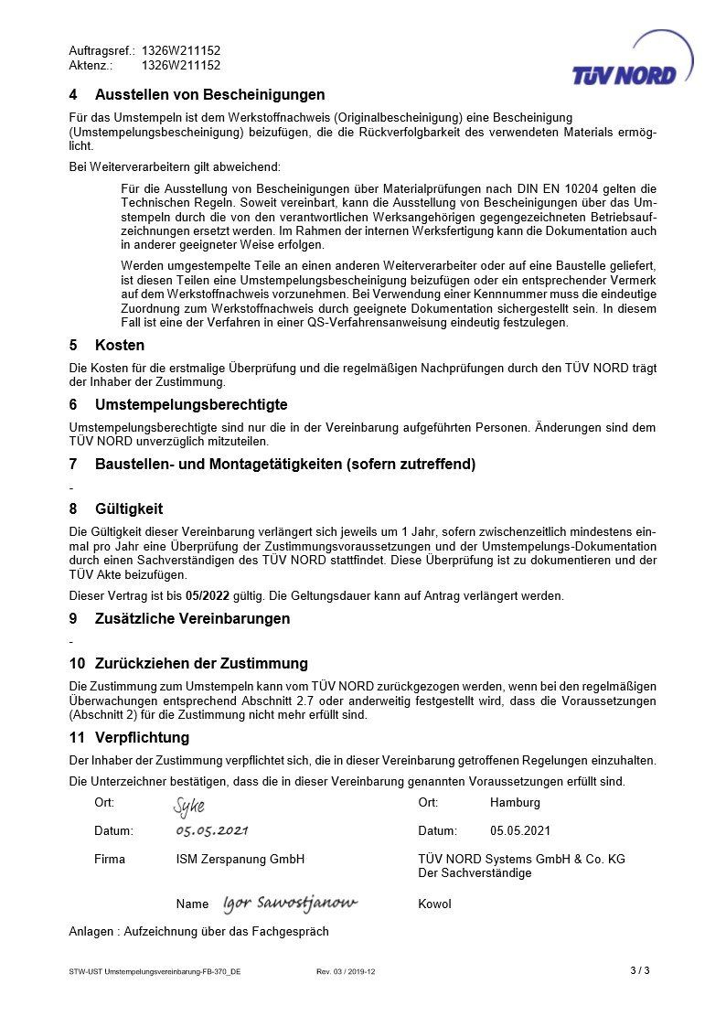 Die Firma ISM Zerspanung GmbH verfügt über die Umstempelberechtigung, um sicherzustellen, dass das Umstempeln von Erzeugnissen mit Materialprüfungsbescheinigungen sachgemäß erfolgt.